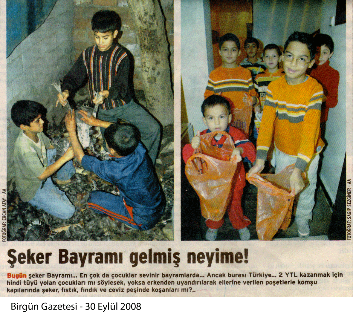 Öylesine dehşete kapılmıştım ki gördüğüm manzara karşısında, biraz önce tabaktaki şekerlerin hepsini alan çocukların durumuna üzülmekle, onların fütursuz davranışlarına kızmak arasında bir duyguyla mutfağa doğru yürüdüm, mutfak masasının kenarına iliştim, o sırada masada duran Birgün gazetesindeki haberle benim biraz önce yaşadığım olayın ne kadar da örtüştüğünü okuyarak kendime geldim. “Bayram Gelmiş Neyime” başlığı ve fotoğraf aslında birçok şeyi özetleyiveriyordu. Aradan yüzyıllar geçmiş, artık şeker evlerde saklanması gereken bir yiyecek olmaktan çıktı diye düşünürüz çoğumuz. Oysa bir bayram günü yaşadıklarım bunun tam tersini kanıtlıyordu. Çocukların bir şeker almak için çırpındığı kentte geleceğe kaygıyla bakmamak mümkün mü?